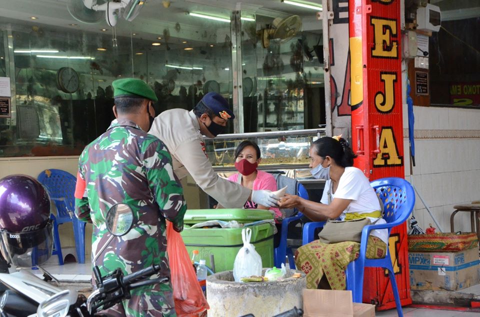 Polda Bali bekerja sama dengan Kodan IX Udayana bersatu melawan Covid 19 melalui kegiatan peduli kasih yaitu bagi-bagi nasi bungkus kepada tukang parkir, orang tua, sopir angkot,tukang ojek, tukang suun di seputaran kota Denpasar. Selasa, 14/4/2020.