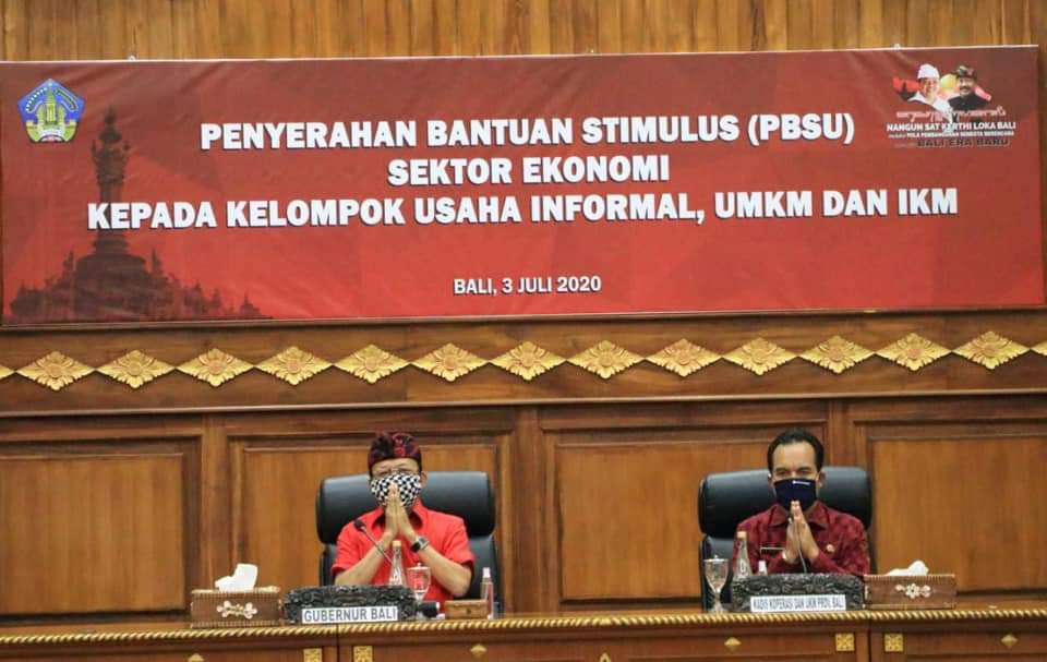 Penyerahan bantuan stimulus ekonomi membantu masyarakat kecil terdampak pendemi Covid-19 itu diserahkan langsung oleh Gubernur Koster secara simbolis kepada perwakilan 9 kabupaten/kota se- Bali, pada Jumat (3/7) di Gedung Wiswa Sabha, Kantor Gubernur Bali, Renon, Denpasar.
