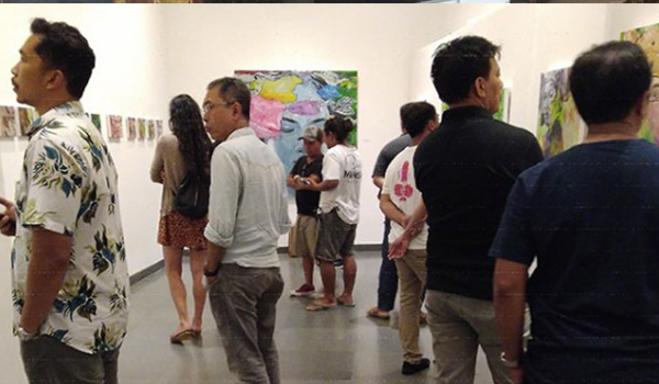 Memasuki ruang pameran The Gallery Maya lukisan ‘Offering to Mother Earth’ terlihat mencolok. Lukisan memperlihatkan potrait wajah perempuan Bali. Ia mengenakan atribut subing di kedua telinganya dengan sejumlah kantong plastik melayang-layang di atas kepalanya.