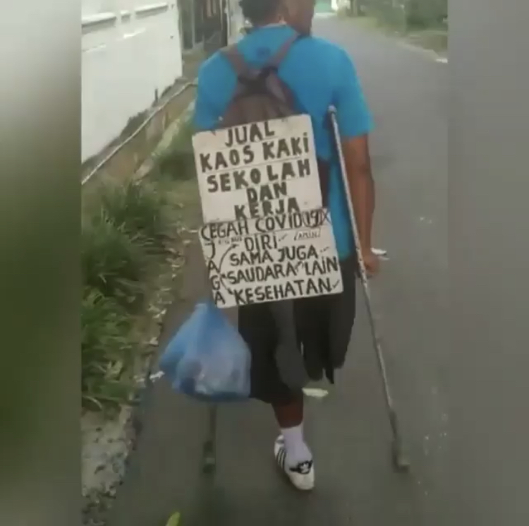 Berbekal kaos kaki dagangan dan dua tongkat, pria itu menyusuri jalanan dengan satu kakinya yang tersisa.