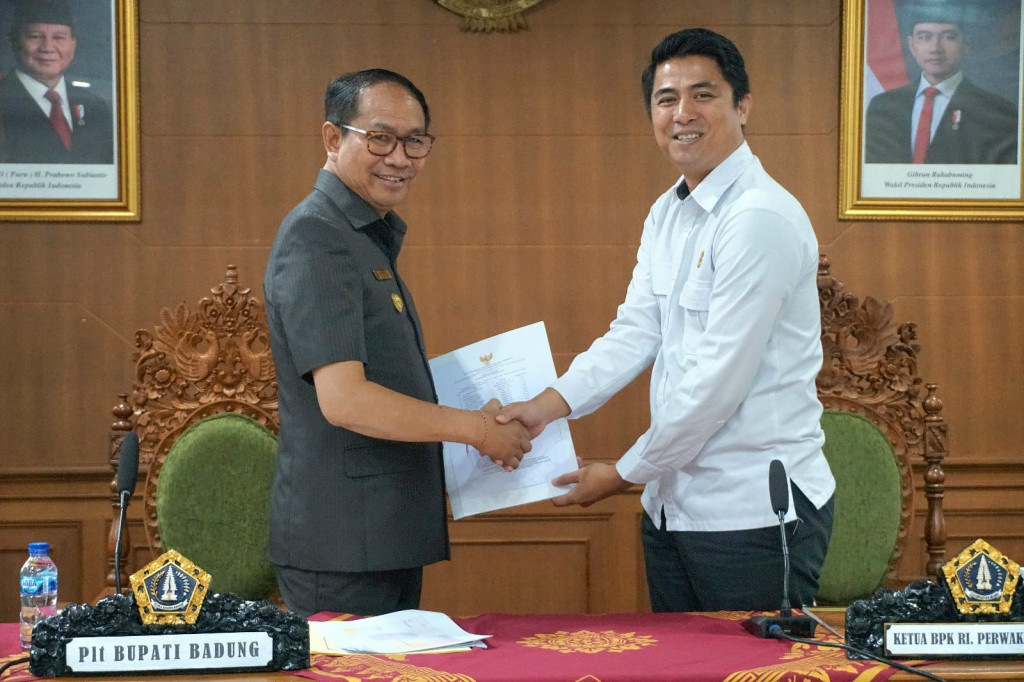 Pemkab. Badung menerima entry meeting Badan Pemeriksa Keuangan (BPK) RI Perwakilan Provinsi Bali, dalam rangka pemeriksaan kinerja atas pengelolaan APBD dalam upaya mendukung pembangunan nasional tahun anggaran 2023 sampai Semester I tahun 2024 pada Pemerintah Kabupaten Badung. Tim BPK yang dipimpin Kepala Perwakilan BPK RI Provinsi Bali diwakili Wakil Penanggung Jawab Tim, Al Kautsar, diterima Plt. Bupati Badung I Ketut Suiasa di ruang Kriya Gosana, Puspem Badung, Rabu (30/10/2024). Turut hadir Pimpinan Perangkat Daerah dilingkungan Pemkab Badung.