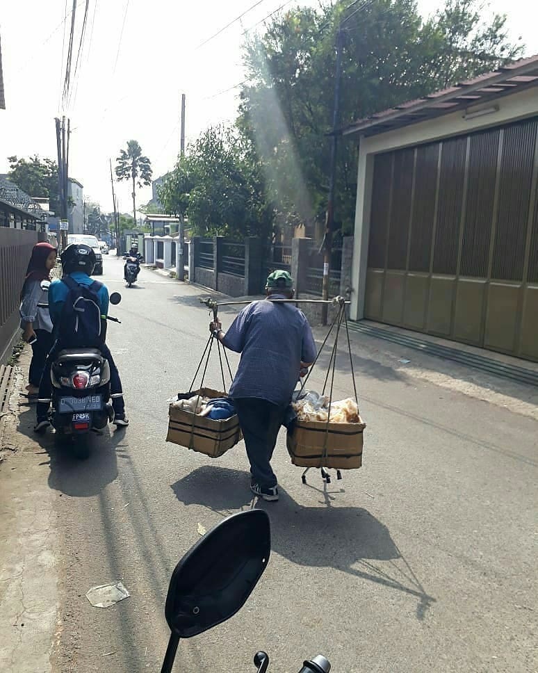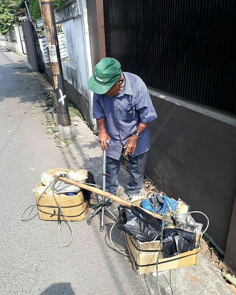 Tubuhnya telah membungkuk, ia berjalan perlahan sambil memikul barang dagangan yang beratnya 12 kilogram di pundak. Betapa keras perjuangan kakek ini untuk hidup.