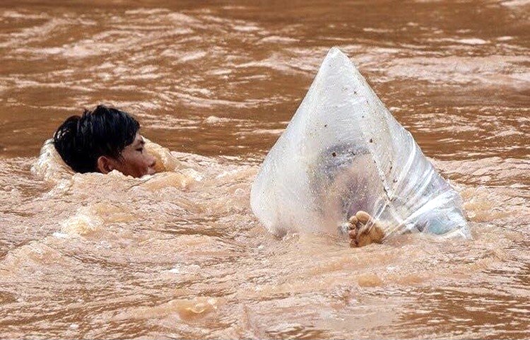 Hal itu mau tidak mau membuat orang tuanya putar otak. Alhasil, agar anaknya tidak hanyut dan seragamnya tidak basah, maka orang tua tersebut mendapat ide untuk membungkus anaknya dalam kantong plastik.