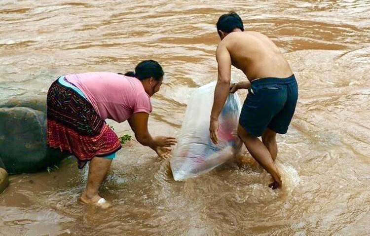 Sementara, untuk menyeberangkannya, sang ayah membantu menenteng kantong plastik yang di dalamnya terdapat sang putra. Saking derasnya, arus sungai kecokelatan itu bahkan hanya menyisakan bagian atas kepala sang ayah saat menyeberanginya.