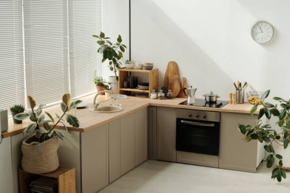 Area countertop memegang peran penting dalam dapur tanpa kabinet atas. Pastikan permukaannya cukup luas untuk aktivitas memasak sekaligus menampung peralatan esensial seperti rice cooker atau coffee maker. Menjaga meja tetap terorganisir akan membantu dapur terlihat bersih dan lapang.